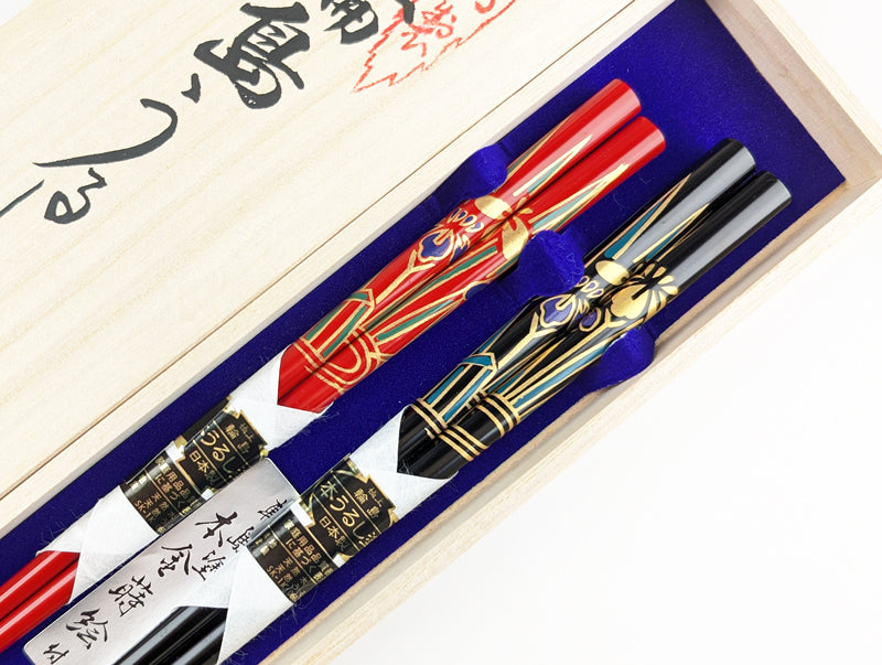 こちらは本金蒔絵であやめを施した夫婦箸の セットで、木箱にお入れしてのお届けとなります。